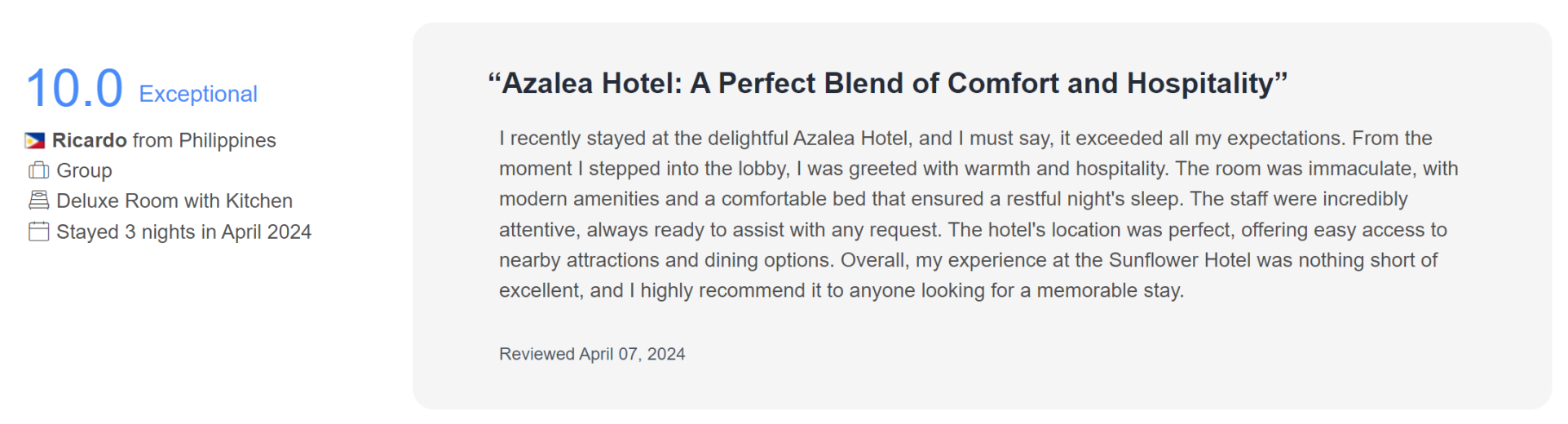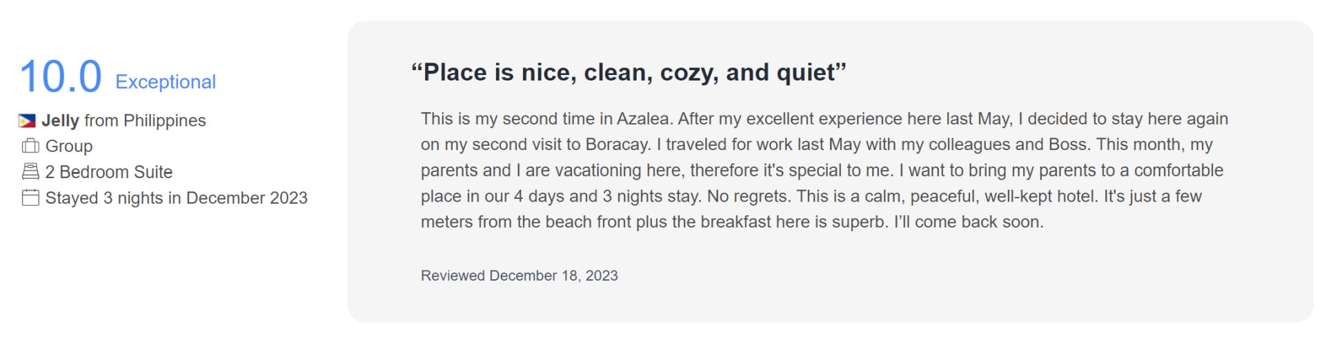 Hear from our esteemed guests as they share their unforgettable experiences and why they fell in love with their stay at Azalea Hotels & Residences Boracay.